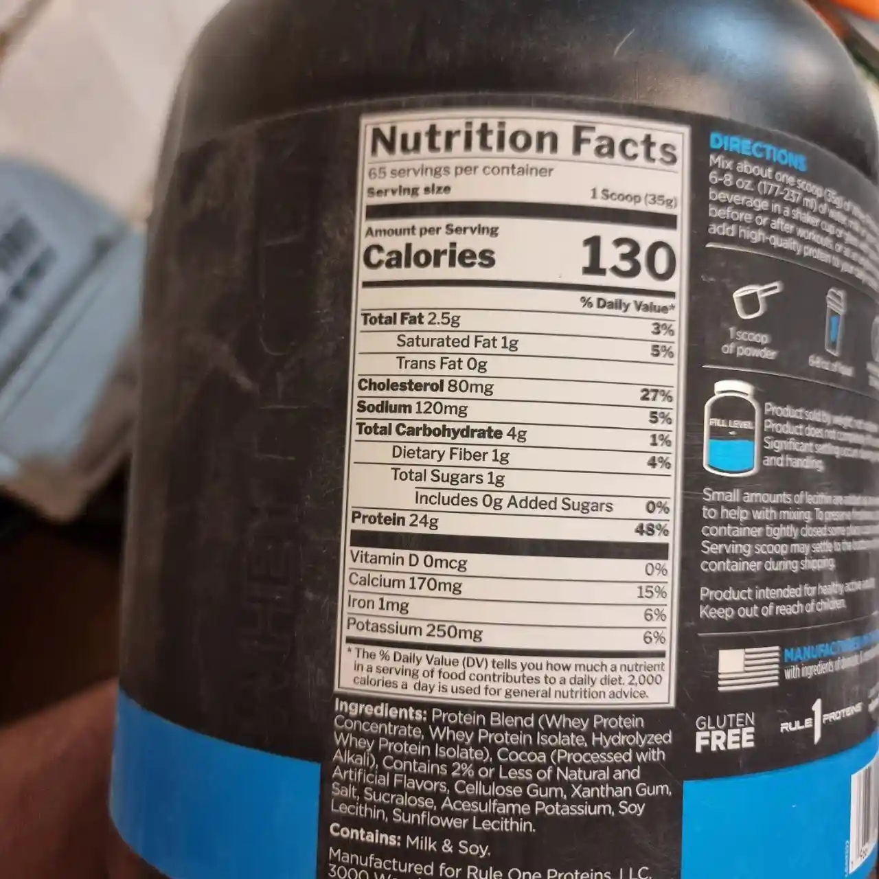 هر اسکوپ ۳۵ گرمی از پروتئین وی rule one شامل ترکیبی از پروتئینهای با جذب بالا و کمچربی است.